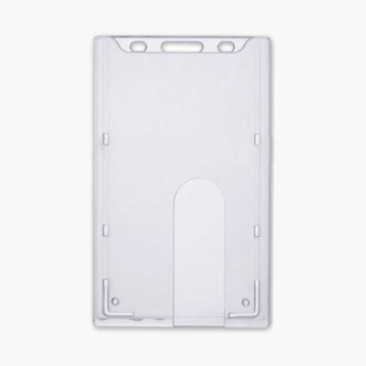 Kruti vertikalni etui za ID karticu ili akreditaciju izrađen je od prozirne krute plastike sa rupom za okovratnu vezicu ili kopču. Vertikalni etui pouzdan je zaštitnik identifikacijske kartice od svih vanjskih utjecaja.