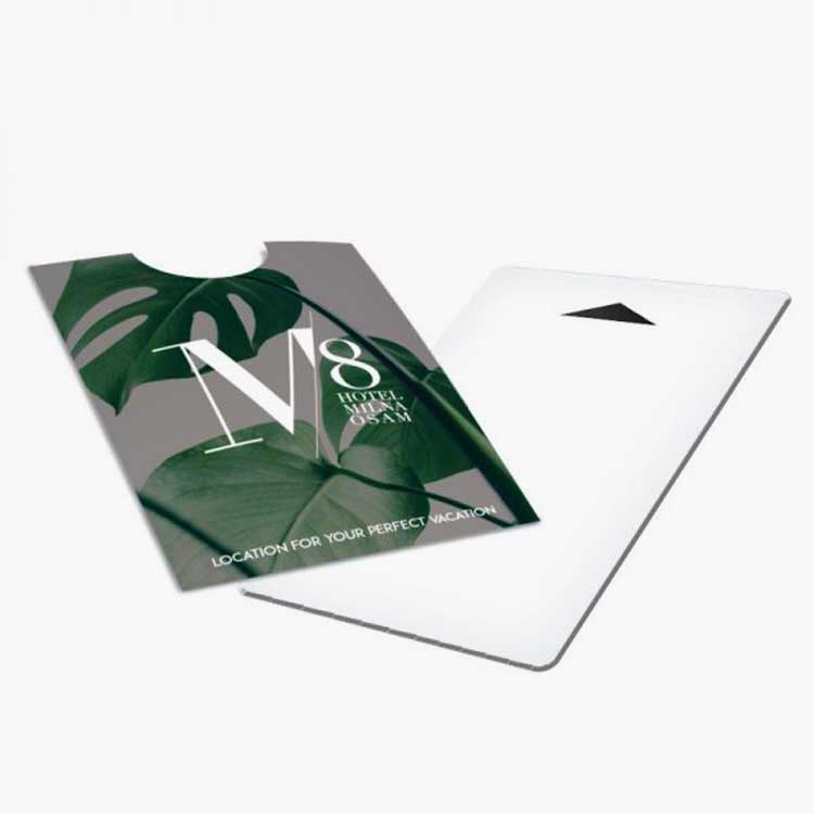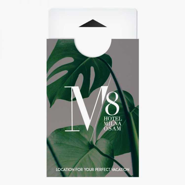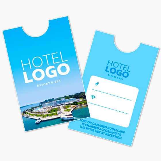Kartonski etui za plastičnu ključ karticu hotela, kampova, hostela, apartmana, … Na etui-e se obično tiska logotip i informacije o objektu, WiFi lozinka te ostavljamo prostor za upis broja sobe. Cijena izrade i tiska kartonskih etui-a najviše ovisi o potrebnoj količini.